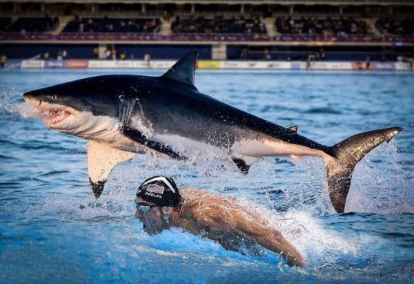 31岁的菲尔普斯代表人类与白鲨对决当之无愧。这位泳坛王者参加了5届奥运会,一共获得28块奖牌,其中金牌数达到23枚,成为现代奥运会116年历史上获得奖牌最多的运动员。