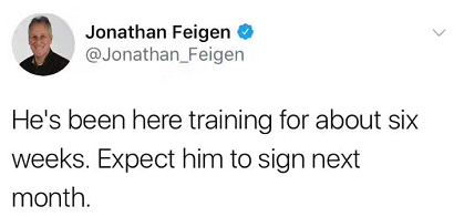 据休斯顿火箭队跟队记者费根透露,火箭与周琦有望在下个月完成签约。一位美国网友在社交软件中向费根问及了周琦的情况,而费根回答到:“他已经在这里训练了六个星期,预计下个月完成签约。”
