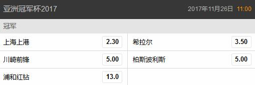 北京时间2017年9月13日,博彩公司更新了最新亚冠夺冠赔率,上海上港在非常惊险的淘汰广州恒大之后,目前在亚冠夺冠赔率榜单中以1赔2.30稳居第一,而希拉尔则是以1赔3.50排名第2,上港的领先优势非常明显!