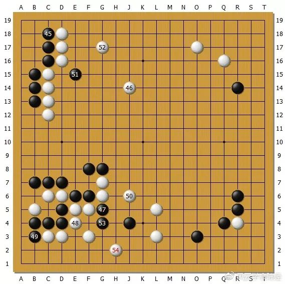 AlphaGo Zero执白对Master。这是双方对局的常见局面,白AlphaGo Zero捞足了实地,Master的中央模样像纸糊的一样被打破,败下阵来。
