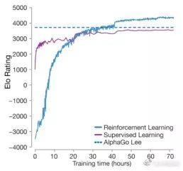 Master和AlphaGo Zero的突破说明,在极高的水平上,需要考虑出现瓶颈的原因。人类棋谱能够提供一个“高起点”,但是机器从零开始训练一两天也就追上了,带来的“先发优势”没多少。而人类棋谱中显然有一些“有害成分”,这可能将AI的学习过程带歪。如果AI不能找到消除这些“人类病毒”的办法,那训练就会陷入瓶颈。如下图,零知识强化学习的版本实力迅速追上有人类棋谱帮忙的。