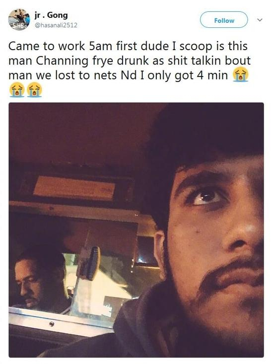 美帝一位网友晒图,照片中骑士球员弗莱正坐在他的车后座上,神情恍惚。这位网友写道:“早上5点起来上班,我接到的第一个乘客居然是弗莱。他喝得烂醉,说球队输给了篮网,而且自己只上场打了4分钟。”