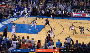 来看看怎么输得哈,打活塞那个,最后5秒钟抢投三分,没进去,雷霆1分惜败。赛后他说,我是在阅读比赛,我要寻找谁是空位,吧啦吧啦……但问题是大哥你那球不是空位啊,有人防啊……难道真跟科比似的三人防守算空位?