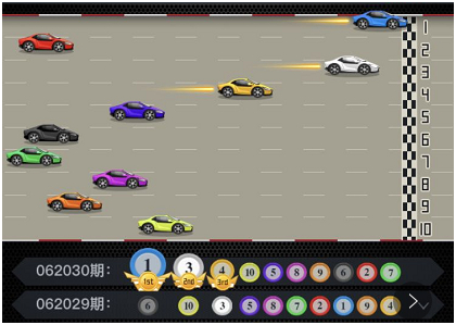 比赛开始之后10辆编号飞车进行激烈的飙车竞赛,最终产生前三名,比赛结束之后就可以看到自己的下注是否中奖。两分钟一期让你玩个够、玩不停!