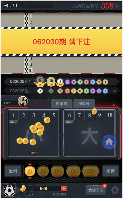 进入逍遥飞车游戏界面,可以看到有从1号到10号共10辆飞车进行竞赛,同时有“押大小”、“押单双”、“押单数”等三种玩法可以选择,你可以选择不同的玩法进行下注,在“我的下注”里可以看到全部自己的注单,
