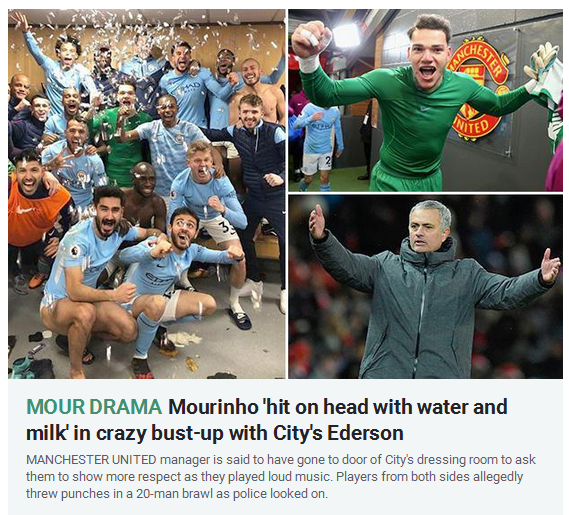 英国媒体普遍确认,曼联曼城赛后更衣室内发生了大规模冲突。穆里尼奥和卢卡库走到曼城更衣室门口,指责曼城门将埃德森缺少“尊重”,穆帅当面指责埃德森在比赛后期拖延时间(《太阳报》说法),但紧接着,双方的冲突迅速升级。曼城助教阿尔特塔在这次冲突中受伤,他的面部流血了。穆里尼奥被水瓶打中,被泼了一身牛奶和水。