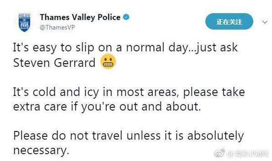 近日英国迎来大雪天气,各地警方也发布了温馨提示。而泰晤士河谷警方的提示当中,出现了杰拉德的名字。该地警方在推特写道:“雨天路滑,小心摔倒,不信你问问杰拉德。”