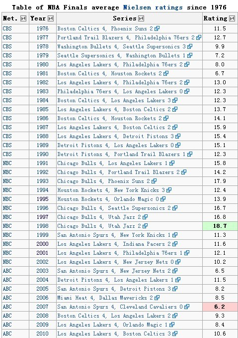 这是到10年的NBA比赛收视率,老爷子在的时候收视率真的是可以,80年代湖人show time时期的收视率也不错。马刺…嗯,收视率毒药。不过,波波维奇不管这个,该怎么玩还怎么玩哈哈~