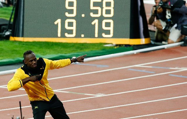 2017年8月13日,博尔特在显示着由他创造的男子100米和男子200米世界纪录的计时器前做出标志性的庆祝动作。新华社 图
