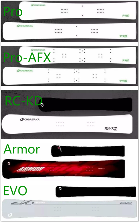 Pro/Pro-AFX是为了冠军打造的赛事级单板系列,拥有最好的速度及稳定性,对滑雪者技术要求很高。二者的区别在于Pro-AFX的嵌入孔可接世界最顶级AllFlex垫板,Pro则不可以。同样可以作为赛事级单板的EVO在1819雪季改为Camber + Rocker的形状,在大幅提升了竞技性能的同时,也变得更加稳定。拥有超深侧切弧度的Armor则是采用玻璃钢夹层,专门为刻滑设计的中高级单板,而RC-KD是专门为喜欢高山竞技的儿童设计的单板。