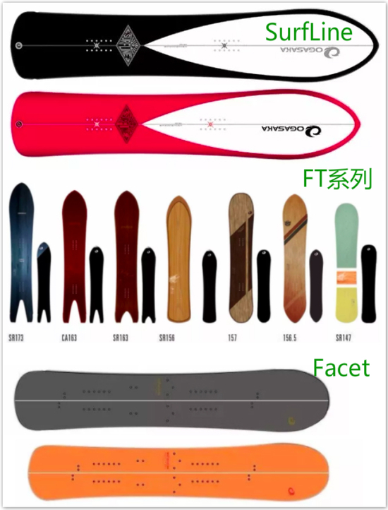 FT系列拥有7个子系列,功能各自有区别,其名字中的数字就代表了其长度。如拥有较长板面的FT-SR173硬度大,适合脚力大的玩家在陡坡上发挥最大性能。FT-CA163是唯一的Camber板型,不仅在野雪上表现优越,同时可以在人工雪道上充分发挥等。Facet是小贺坂中登山滑雪专用的分离式雪板,所有部件全部采用昂贵材料制作,更轻,锁止效果更好,是真正“能够帮助滑手充分体验登山滑雪乐趣”的存在。