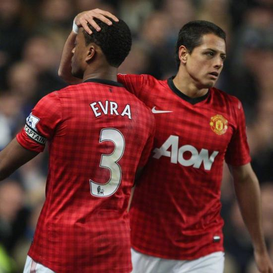 2012年,斯坦福桥,埃弗拉与小豌豆庆祝进球;2018年,斯坦福桥,埃弗拉与小豌豆庆祝进球