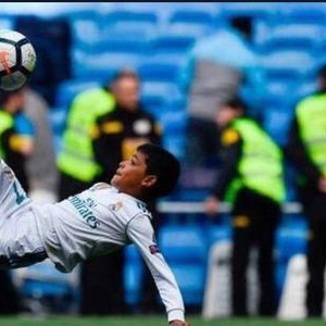 C罗在上周对阵尤文打进倒钩之后,他的大儿子迷你罗也不甘示弱。西班牙媒体拍到,在赛前热身时,巴斯克斯叔叔开出了一个恰到好处的传中,而禁区内的迷你罗立刻后仰用倒钩的动作将球打进。