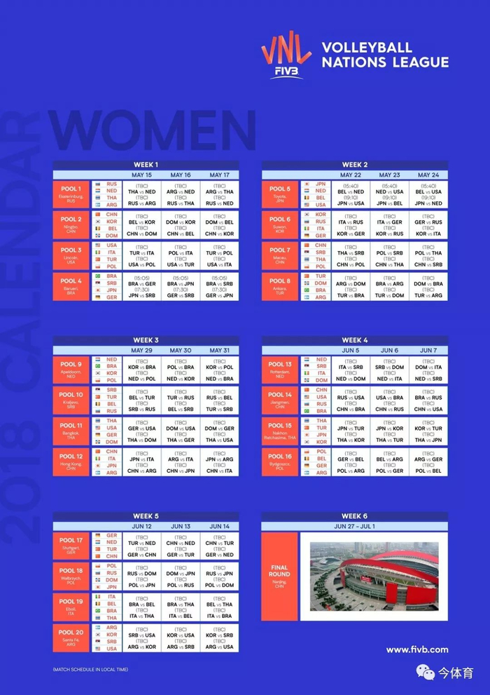 今年世界女排国家联赛由五个分站赛以及最终的总决赛组成,中国队的前四站比赛都将在国内参赛,首站比赛将是5月15日至17的宁波北仑站,对手是比利时队、多米尼加队和韩国队。随后三站分别是中国澳门站、中国香港站和江门站,第五站中国女排将前往德国参赛。由于南京自今年起连续三年承办世界女排国家联赛总决赛,中国队作为东道主也不存在入围总决赛的压力,因此如李盈莹、王媛媛、段放这样的年轻队员或许在分站赛中会有更多出场锻炼的机会。