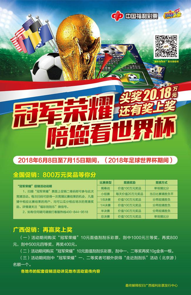 2018年6月8日至7月15日2018年足球世界杯期间,广西福利彩票开展买“冠军荣耀”赢奖上大奖活动,与您一起嗨翻世界杯!