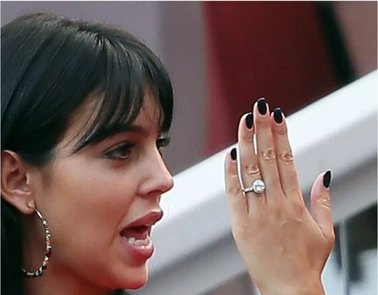C罗女友乔治娜现场助威,最引人瞩目的,则是她无名指上的巨大钻戒!这钻戒一现,便引发了她和C罗已订婚的传闻。 据报道,这个是C罗上个月买的卡地亚钻戒,价值615000英镑(约532万人民币)
