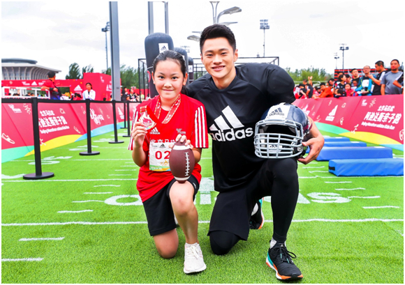 本次赛事,阿迪达斯特别为孩子们打造了一个超4000平方米的“运动嘉年华”,设有篮球、足球、平衡车、皮划艇、橄榄球等多项目的趣味互动。“闪电教官”谢震业更惊喜现身互动体验区,与孩子们热情互动。在橄榄球区,谢震业换上装备化身人形障碍,为小选手开启难度升级的的橄榄球训练体验。而后他又来到趣味竞速跑项目中,在赛道旁为小跑者提供悉心指导,传授跑步的小诀窍。