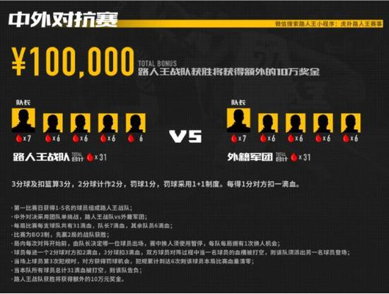 作为路人王月度重点赛事,中外对抗赛的奖金可谓令人垂涎。只要代表路人王出战的5位选手最终获得比赛胜利,他们将得到总计10万元的奖金。因此,无论是得以参加高水平篮球竞技的机会,还是赢得最终比赛的丰厚奖励,于任何选手而言都极具吸引力。