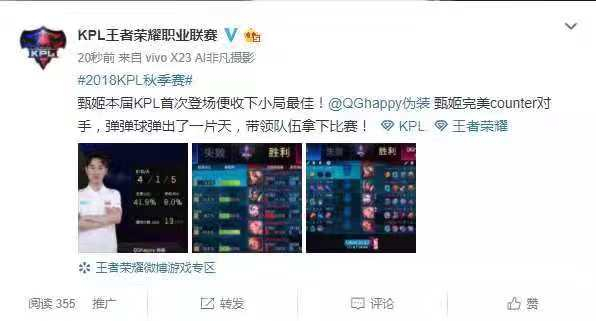 伪装的甄姬:在第二个比赛日中,QGhappy中单伪装拿出了久违了的甄姬,并且豪取MVP,作为王者荣耀最古老的几个中单英雄之一,甄姬自从第一届KPL之后就再也无缘在职业赛场中亮相,而熟悉王者荣耀的玩家都知道,甄姬绝对是钻石以前的一个上分利器,但到了钻石局以后,甄姬往往就会感到有些无力,但如今,职业赛场上再次出现甄姬的身影,或许能让那些老甄姬玩家找到在钻石以上分段驾驭甄姬的奥妙。