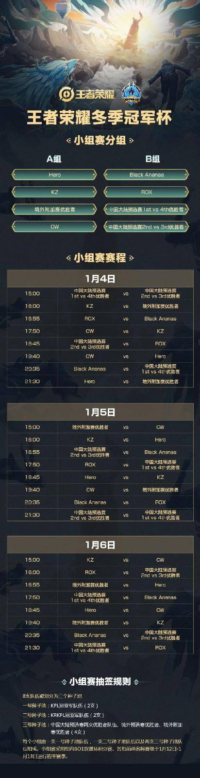 本届冬季冠军杯关于境外赛区晋级的规则为KRKPL秋季赛冠亚军直接晋级,两席;KRKPL之外的其余境外战队通过预选赛决出第一名晋级冬冠杯正赛,一席;KRKPL季军与境外赛区预选赛第二名通过附加赛决出最后一席。KRKPL的冠亚军分别是KZ和ROX,预选赛第一名为来自香港赛区的CW,而澳门赛区的EMC则是通过附加赛战胜MVP拿到的最后一张正赛门票。