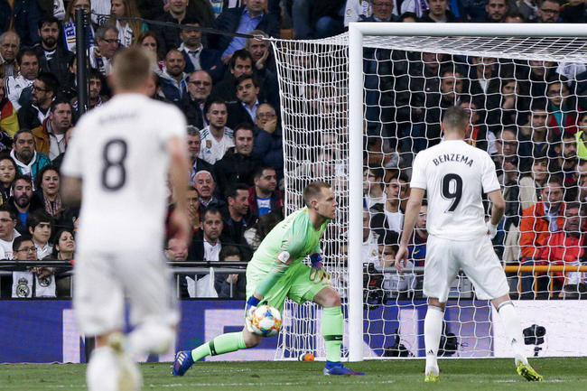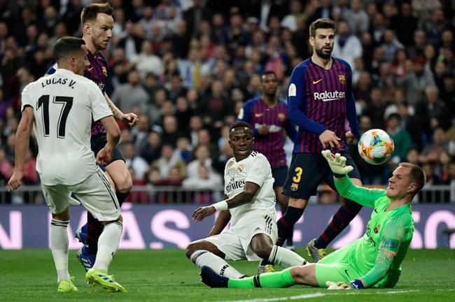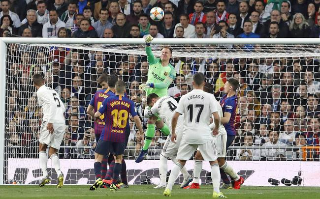 登贝莱禁区左侧低传,中路的皮克和远点的朗格莱都没碰到。皇马第37分钟再度错过机会,皮克前场被断球,卡塞米罗中圈直传,维尼修斯突入禁区左侧距门11米处左脚射门被朗格莱飞身封堵后横传,无人盯防的本泽马在门前10米处左脚半凌空捅射被特尔施特根伸脚挡出!仅过1分钟,卡塞米罗中路铲传,雷吉隆禁区左侧横传,维尼修斯在门前8米处左脚扫射打高!