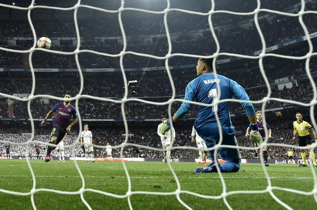 仅过3分钟,苏亚雷斯突入禁区左侧遭卡塞米罗踩踏脚面倒地,点球!苏亚雷斯亲自操刀骗过纳瓦斯吊射得手,3比0!皇马大势已去。费德里科-巴尔韦德换下卡塞米罗;库蒂尼奥换下登贝莱;比达尔换下苏亚雷斯;阿森西奥换下维尼修斯,随后接到克罗斯传球,禁区左侧打高。