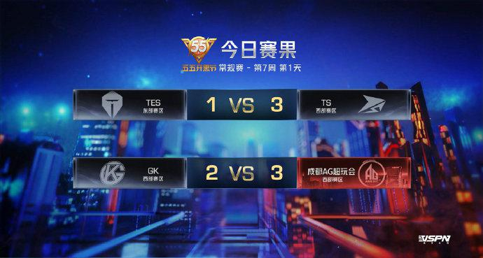 4月29日,KPL春季赛常规赛第7周第1日,TS以3-1战胜TES,成都AG超玩会以3-2战胜GK。