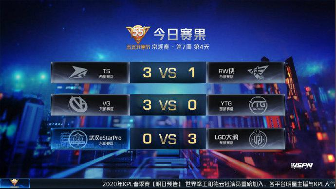 5月2日,2020KPL春季赛常规赛第7周第4日,TS以3-1战胜RW侠;VG以3-0战胜YTG;LGD大鹅以3-0战胜武汉eStarPro。