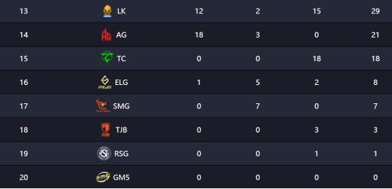 未进入总决赛的战队将会遭遇淘汰,从目前的积分来看,至今未取1分的GM5与仅积1分的RSG最后一周至少要进入前三,方才能够晋级,以他们目前的状态来看,难度颇大;前方的ELG、SMG以及TJB目前积分都不到10分,也都处于比较危险的位置,最后一周的比赛,他们需要尽全力一搏,方才有机会搭上总决赛的末班车。