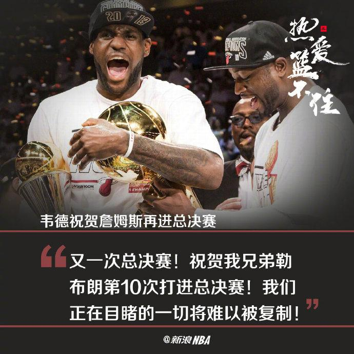 韦德为詹姆斯发来贺电:“又一次总决赛!祝贺我兄弟勒布朗第10次打进总决赛!我们正在目睹的一切将难以被复制!!”