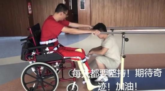 画面中,郑亮借助牵拉带站了起来,眼神中满是坚毅;护工压着他的腿,他仅用上半身的力量做着俯卧撑,表情里满是艰难不易,但更能看到他的不放弃。
