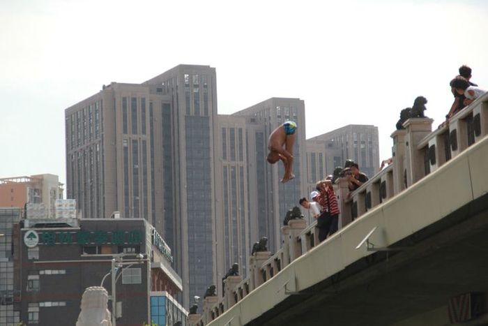 “跳水过程经常要维持一整天,围观的人越多跳的越起劲,跳到河里,游到岸边,再走上桥,再跳下河,如此往复。”