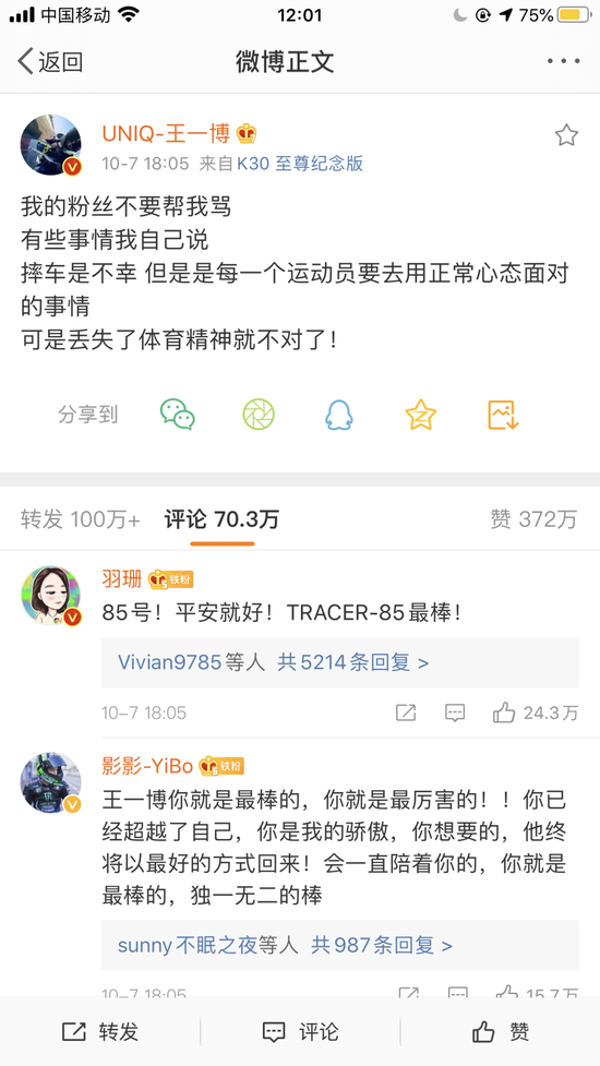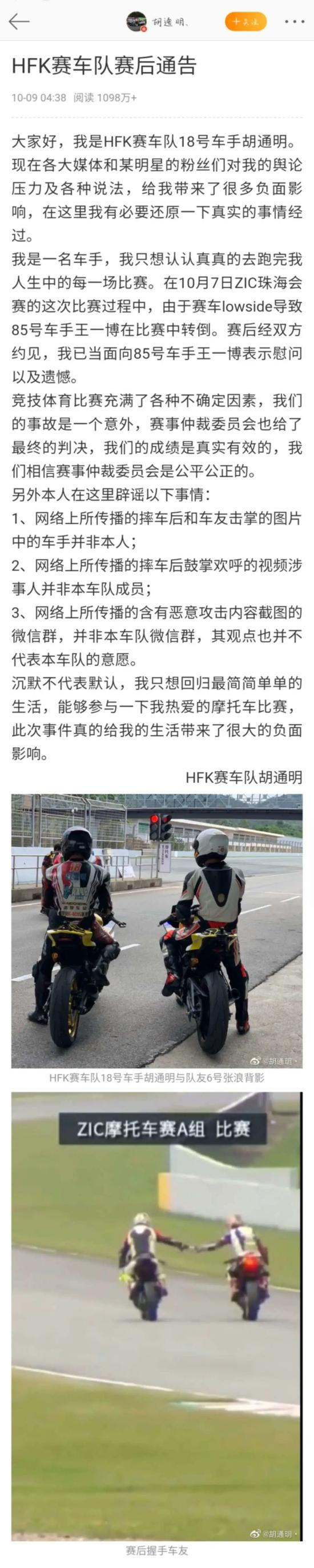 王一博赛后发微博,显示了其有担当的一面;而胡通明也在9日更新了许久未动的微博,发布了车队的赛后通告。