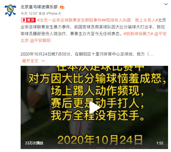 微博@北京皇马球迷俱乐部 晒出一段视频,内容是北京业余足球联赛发生暴力事件。该微博账号称,前国安球员南某球队因大比分输球大打出手,致拉架球员腰部受伤入院治疗,赛事主办方至今无任何表态。