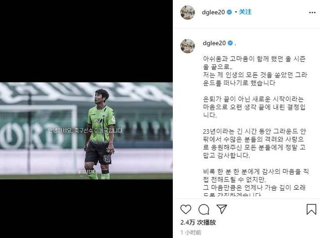 现年41岁的韩国前锋、效力于全北现代的李同国宣布,将在本赛季结束退役,结束23年职业生涯。