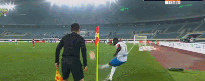 泰达vs建业的比赛进入加时赛中,泰达前锋苏亚雷斯在中场附近一脚吊射,而这脚吊射并无威胁且偏出球门,但建业门将吴龑竟然将球碰出底线,送给泰达一次角球机会。而正是利用这次角球机会,宋岳头球破门,这也是宋岳加盟泰达以来的第二粒进球。