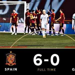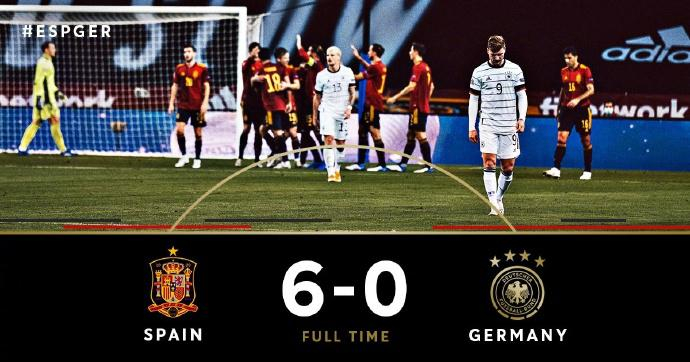 欧洲国家联赛A4组第6轮,西班牙6-0狂胜德国,反超对方夺得头名,晋级决赛圈4强。德国遭遇89年来最惨失利,以及史上正式比赛最惨失利!