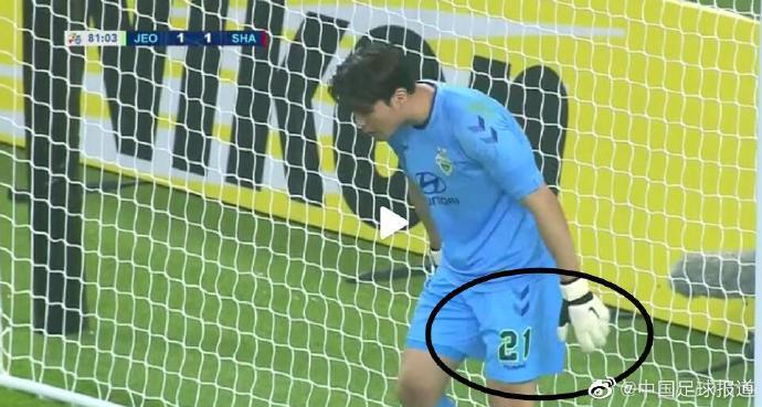 全北门将宋范根应该是31号,上衣也是31号。但注意看短裤,是21号……就这样踢了一整场。