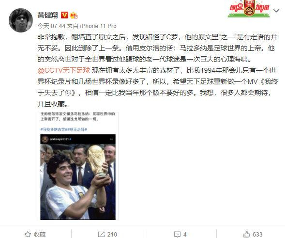 马拉多纳去世C罗第一时间发文悼念,@黄健翔 对C罗的用词进行“纠错”:“请你把(有史以来最好的球员)‘之一’二字拿掉。大家都知道你很棒。但是此刻,没有别人,只有唯一。” 随后他对此事道歉:非常抱歉,查了原文发现错怪了C罗。他的原文里‘之一’是有定语的并无不妥。