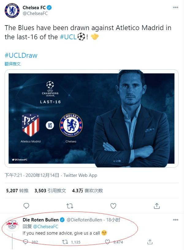 德甲球队莱比锡红牛的官博来到了切尔西官博下送上了“贴心”问候:“如果你需要一些建议,可以找我。”