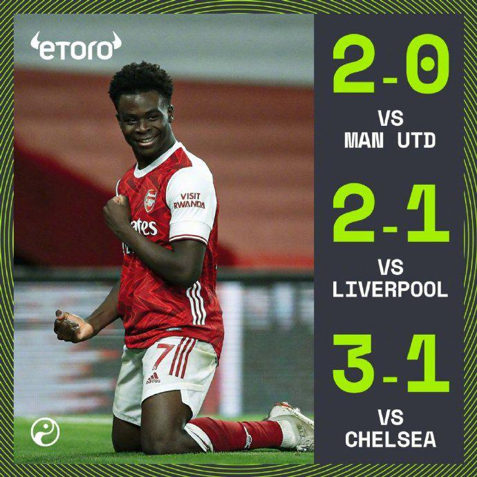 阿森纳2020年英超主场对Big6球队保持全胜