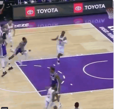 保罗在前场接球,面对后面扑过来防守的福克斯,一个下蹲假动作晃飞后者,福克斯跃起地太猛,直接从保罗头上飞跃了过去。