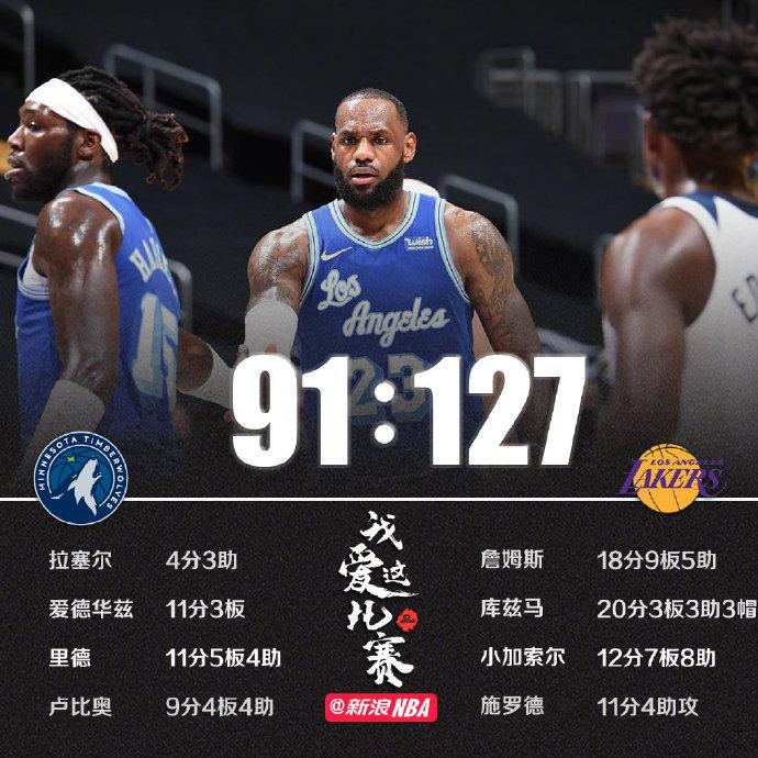 湖人大胜森林狼 库兹马20分