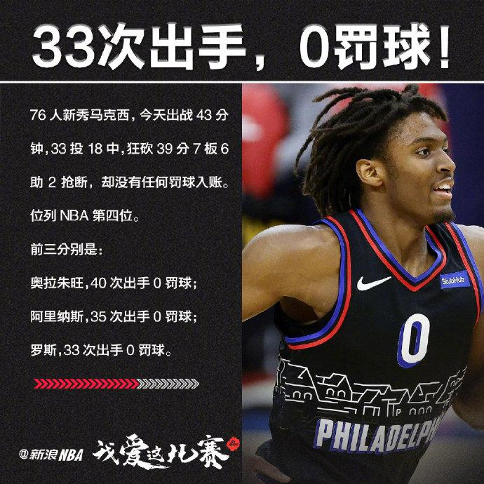 76人103比115不敌掘金,本场比赛马克西出战44分钟,疯狂出手33次命中18球,其中三分8中3,没有罚篮轰下39分7板6助2断的亮眼数据,39分也创造了本赛季新秀的单场得分新高。