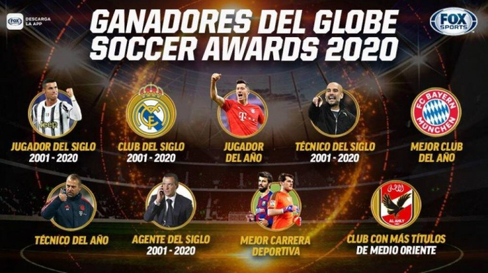 20年最佳球员C罗;20年最佳俱乐部皇马;最佳教练瓜迪奥拉;最佳经纪人门德斯;本年度最佳球员莱万;最佳俱乐部拜仁;最佳教练弗里克。