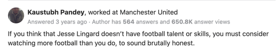 美国知乎Quora三年前有一个问题是:为什么林加德这样缺乏天赋的球员,却能在曼联踢球?