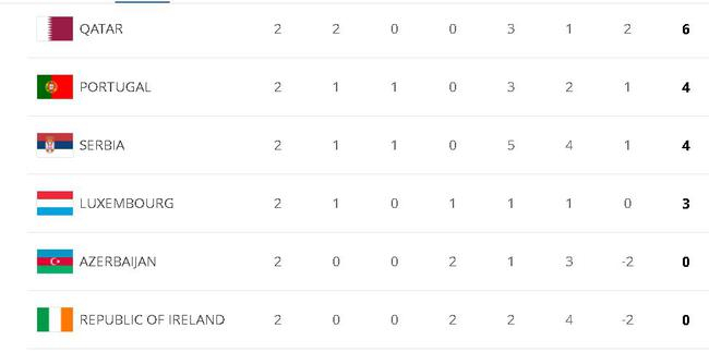 和卡塔尔同组的有葡萄牙、塞尔维亚、卢森堡、阿塞拜疆、爱尔兰,结果卡塔尔2战2胜积6分力压葡萄牙排名第一。