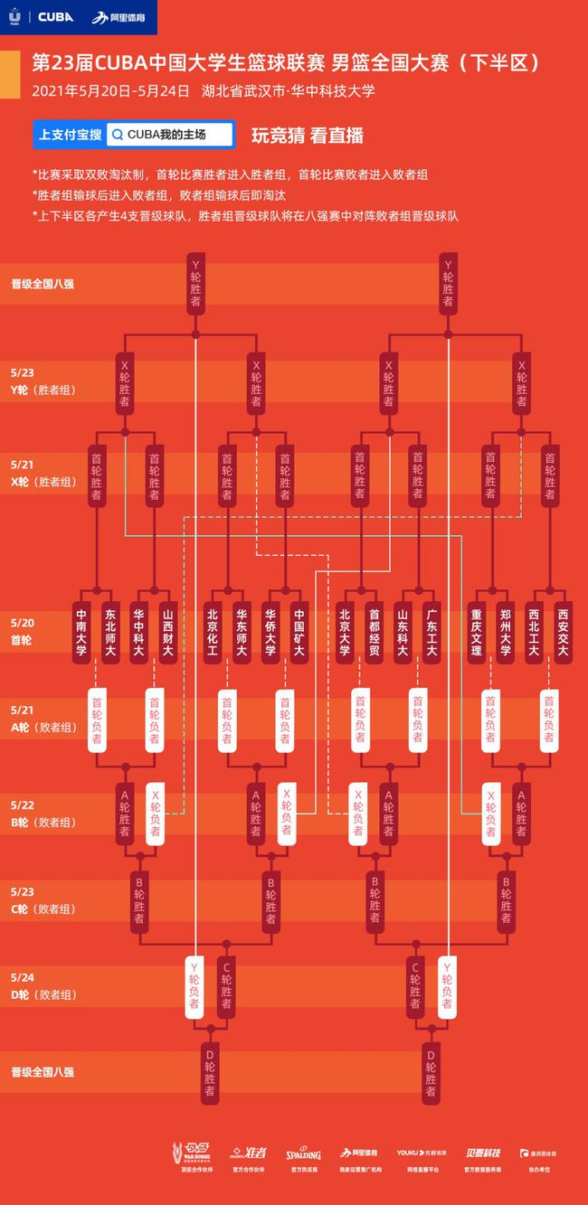 今年的CUBA全国大赛将采用双败淘汰赛制:32支球队根据抽签和落位结果被分为上、下两个半区,分属这两个半区的球队在32强阶段不交手,上下半区将通过双败淘汰赛分别决出4支晋级球队。