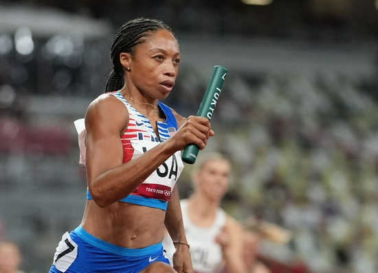 8月7日,美国队队员阿莉松·菲利克斯在女子4x400米接力决赛中。