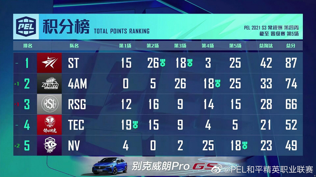 9月16日,2021 PEL和平精英职业联赛S3赛季第四周首日晋级赛结束,经过5场激烈角逐,上周周冠军ST延续火热状态,以42个淘汰、单日拿下87分获得第一,成功晋级第四周周决赛,4AM、RSG、TEC和NV分列二到五位,也成功晋级周决赛。
